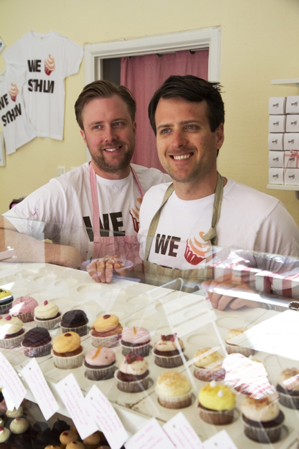お店に入ると甘くておいしそうな匂いとともに、目に飛び込んでくる色とりどりに並べられた大小のカップケーキ、その後ろでかわいらしいピンクのエプロンをして微笑むオーナーのマーティンとミカエル。この小さなお店から一日300〜400個、週末には1000個ものカップケーキが売れていくというから驚きです。