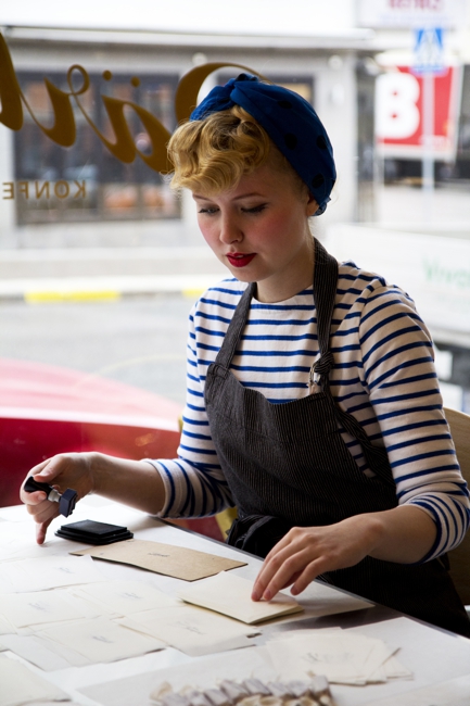 このパーランス、キャラメルのおいしさはもちろん、30年代~40年代スタイルに統一されたお店のインテリアとスタッフのファッションも魅力のひとつです。アンティークの家具や30年代の映画のパンフレットが飾られた趣のある店内には、リサやスタッフが大好きなジャズがいつも流れています。昔の映画に出てきそうなヘアースタイルにボーダーのTシャツ、そしてリサお手製のネイビーのハイウエストパンツを身につけたスタッフの女の子たち、そのスタイリングの徹底ぶりといったら素晴らしい!の一言につきます。30年代、40年代の古くてかわいいものが大好きだという彼女たち、じつはリサの趣味であるリンディーホップ・ダンス仲間だとか。今でも時間がとれる時はみんなで集まってダンスをしているそうです。
